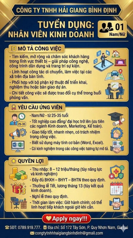 Tuyển dụngTHÔNG BÁO TUYỂN DỤNG NHÂN VIÊN KINH DOANH Đã đăng trên 18/03/202618/03/2026 bởi Admin 18 Th3 ——————————————— CÔNG TY TNHH HẢI GIANG BÌNH ĐỊNH Address: Số 172 Tây Sơn, Phường Quy Nhơn Nam, Tỉnh Gia Lai Hotline: 0789.919.777 Email: [email protected] Website: haigiangbinhdinh.com Admin 📢 THÔNG BÁO LỊCH NGHỈ TẾT NGUYÊN ĐÁN 2026